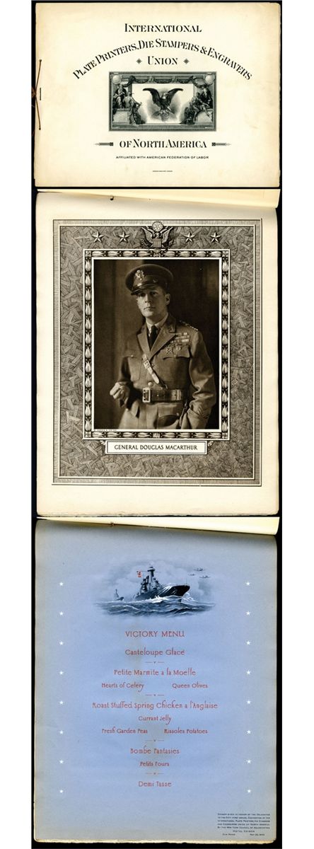New York, 1943, 12.5 x 10 inches, Inner front page has 1943 ABN printed souvenir plate with allegorical angels; also includes numerous artist signed engravings, VF to XF condition. ABN.