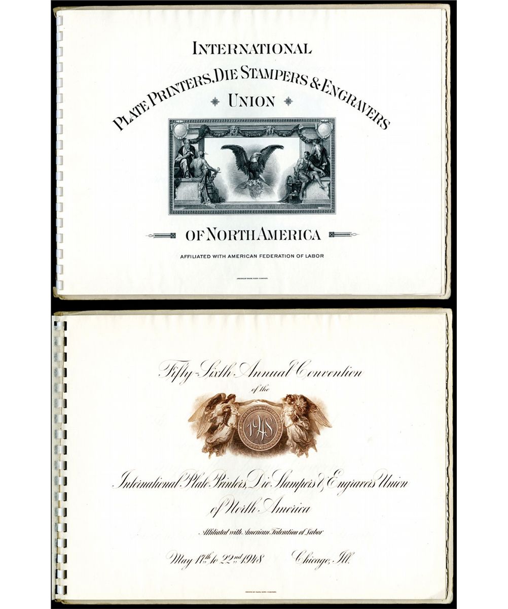 New York, 1948, 12 x 9.5 inches, The booklet front page was engraved by ABNC with image of banknote similar to Canadian Bank of Commerce allegorical vignettes with eagle on globe in middle; the second page is in brown, also by ABNC, with allegorical angels flanking "1948" date; various plates are included with two signed by the artist or printer, a large format engraving of Truman is also included but not bound in, XF condition, Rare Convention booklet. ABNC.