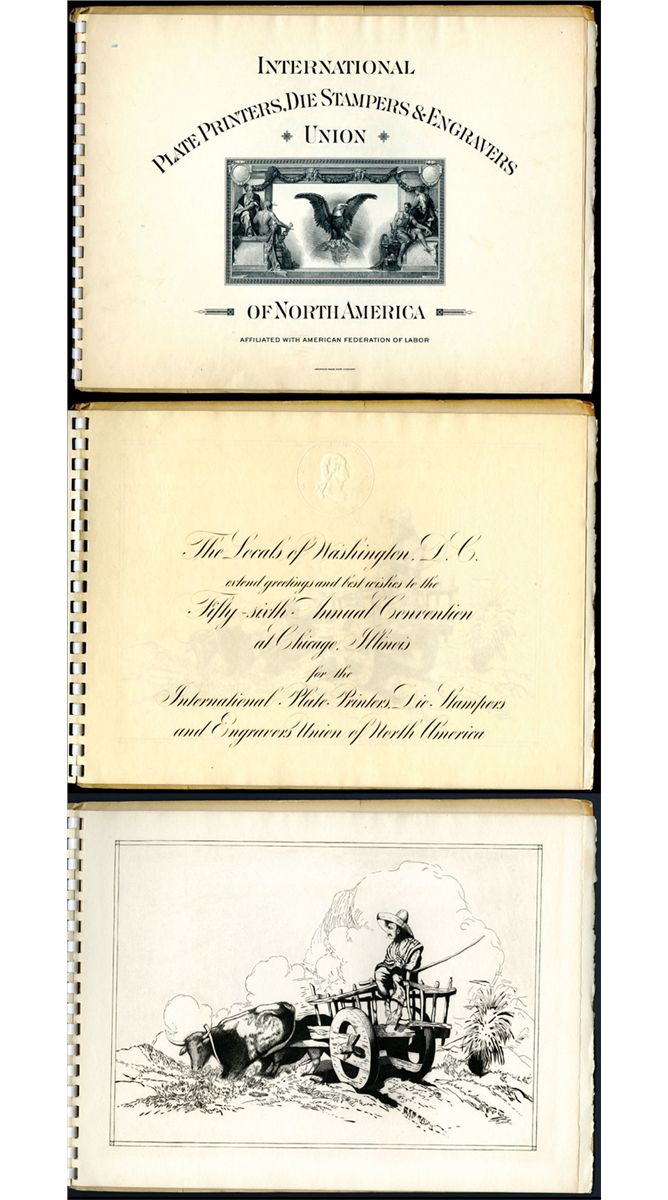 New York, 1948, 12.5 x 10 inches, Inner front page has 1948 ABN printed souvenir plate with allegorical angels; also includes numerous artist signed engravings, VF to XF condition. ABN.