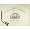 New York, 1952, 12.5 x 9.5 inches, Purple cover plate with allegorical women flanking world globe engraved by ABNC as well as the second page plate; 11 pages with additional engraved images including Rockefeller Center, Harbor scenes, Brooklyn Bridge and other views. Cord tied booklet in XF condition, Rare Convention booklet. ABNC.