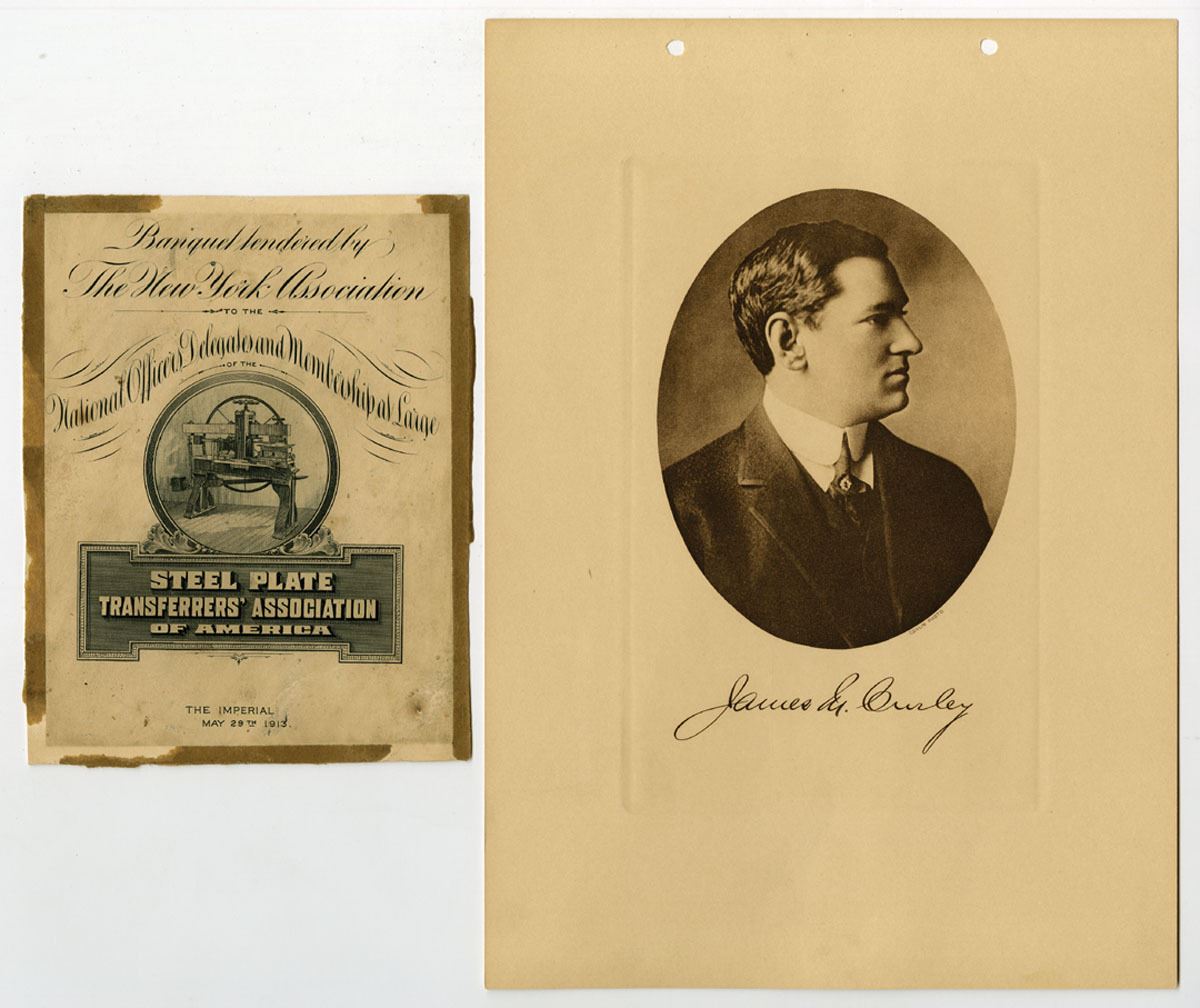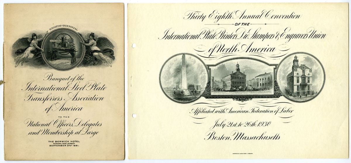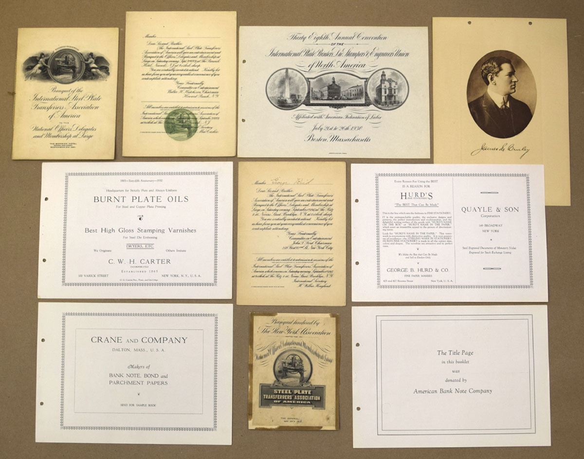 Various States. Lot of 5 Items, Includes: Steel Plate Transferrers' Association of America, Banquet Invitation from 1913, 1917, and 1921. Also includes program from 1921 Banquet; International Plate Printers, Die Stampers & Engravers Union of North America, 1930, Front cover and some internal pages from Convection Souvenir Program. Items range from VF to Uncirculated condition. ABNC.