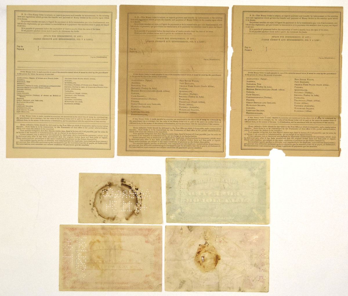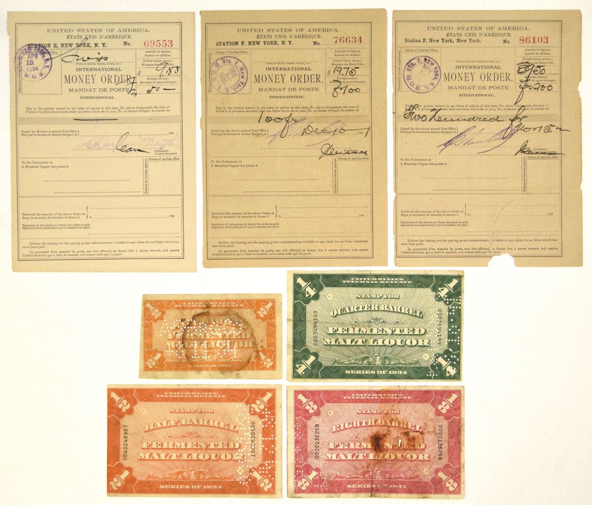 U.S., 1891-1947. Lot of 7 items, Includes: 3 United States International Postal Money Orders issued from New York postal stations, each with handwritten entries, serial numbers, and circular postal cancellation handstamps dated 1891, 1892, and 1894. Also included are 4 U.S. Internal Revenue fermented malt liquor tax stamps, including Quarter Barrel (Series of 1933), Half Barrel (Series of 1933 and Series of 1934), and Eighth Barrel (Series of 1947), Each printed in different colors with serial numbers and punch cancellations indicating use. The money orders show typical postal handling while the tax stamps exhibit punch cancellations and light wear consistent with use. Conditions range from Fine to VF condition. (7). Sold “AS IS” no returns accepted.