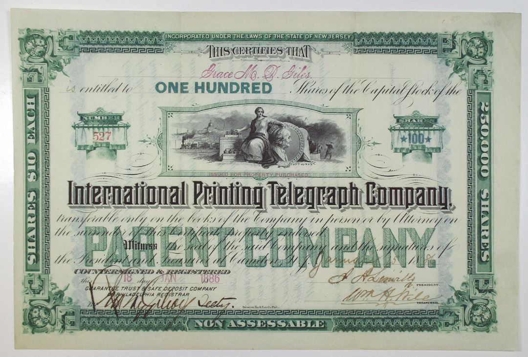 New Jersey, 1881. 100 Shares I/U Capital Stock Certificate, Black text with green border and underprint, Allegorical woman with Ben Franklin portrait and device at center. VF condition, ABNC.