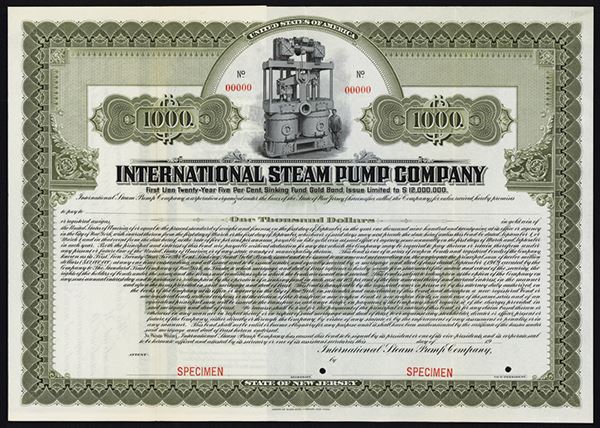 New Jersey, 1909, International Steam Pump Company, $1000, 5% Specimen Gold Bond, Olive green and black with giant steam pump with small man standing next to it. XF condition. Specimen overprints, ABNC. Benjamin Guggenheim was elected president of the company in 1909. He was one of seven sons of Swiss-born industrialist Meyer Guggenheim and was sometimes called the “Silver Prince,” and earned his nickname from his interests in Silver mining in Colorado. Guggenheim started building mining machinery that later became part of the International Steam Pump Company in 1906. He tragically perished in the Titanic disaster of 1912. Rare bond from this historic Guggenheim owned company.