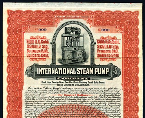 New Jersey, 1909, $100 US Gold, 1st Lien 20 Year 5 % Sinking Fund Gold Specimen Bond, POC's, VF-XF condition, ABNC. Bond also payable in Sterling, Francs and Guilders. Benjamin Guggenheim was an heir in the wealthy Guggenheim family. At the age of 20, Guggenheim went to Colorado to handle the family's mines in Leadville. After taking a break in Europe, Guggenheim returned to the United States and started building mining machinery. That business later became part of the International Steam Pump Company in 1906. Guggenheim was elected president in 1909. Following a trip to Europe in 1912, he decided to sail on the maiden voyage of the Titanic in which he perished.