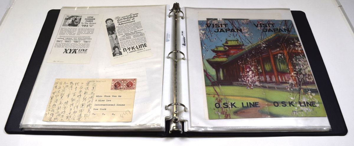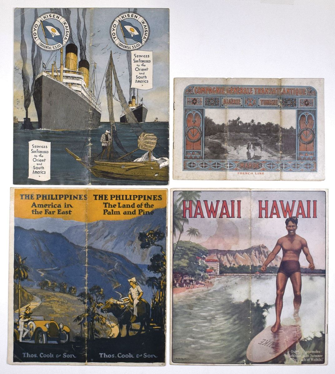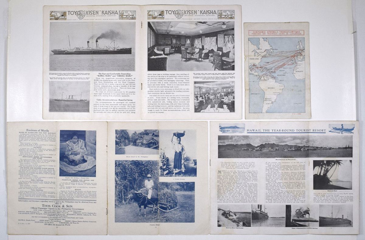 Various Countries including China, Japan and others. Binder of international steamship and cruise line ephemera spanning 1900s to 1930s, featuring passenger lists, brochures, advertisements, booklets, and postcards from major transatlantic, Caribbean, and Pacific routes. Transatlantic highlights include a 1918 Compagnie Générale Transatlantique passenger list with map, a 1936 French Line advertisement, a 1930 White Star Line/Red Star Line – International Mercantile Marine Co. advert, Mediterranean Cruise M.S. Augustus pamphlet, and a 1934 Italian Line cruise pamphlet. Caribbean and West Indies materials feature 1929–30 West Indies cruise adverts; port cards of the Borinquen and Coamo from Porto Rico Lines; postcards of the Talamanca and S.S. Jamaica from United Fruit Co.; and Great White Fleet advertisements from 1929–35. Pacific and Asian travel pieces include a 1920 Hawaii tourist magazine; a 1920 China Mail Steamship Co. advertisement; a 1919 Philippines advertisement magazine; 1920s Toyo Kisen Kaisha Oriental S.S. Co. advert magazine and 1908 postcard; postcards of S.S. Kashima Maru and S.S. Phinx; 1928 NYK Line advertisements; “Visit Japan” OSK Line brochures from the 1930s; Japan Tourist Bureau travel adverts; and a Japanese Government Railways booklet. Also included are assorted postcards with ship images. A diverse and visually appealing grouping showcasing early 20th-century global passenger shipping and cruise promotion. (Garden State Railroad Collection).