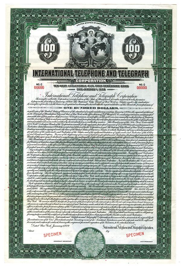 Maryland. $100 Specimen 4 1/2% Convertible Gold Debenture Coupon Bond, Black print on green border and under tint, Winged allegorical figure standing between two hemispheres of the world, Specimen overprints and POC's, VF-XF condition, ABNC. ITT was found in 1920 when its founders acquired the Puerto Rice phone Co. and Cuban-American Telephone and Telegraph Co. and part of the Cuban Telephone Co. In the 1930's ITT purchased German Companies and had done some business with Hitler and Himmler.
