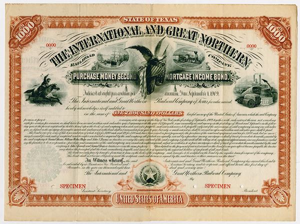 Texas. $1,000 Specimen 8% Purchase Money Second Mortgage Income Bond, Black print on brown border and under tint in horizontal format, Multiple images on certificate, largest of a Patriotic Bald Eagle holding flag and shield at center under title and over seal of Texas at bottom, Specimen overprints and POC's, Choice Fine condition with archival reinforcement of splitting at top middle border fold. Listed railroad but never seen in cox previously, This is the exact example pictured in Cox. No issued examples are known on this railroad and this was the only specimen found. This is it. ABNC.