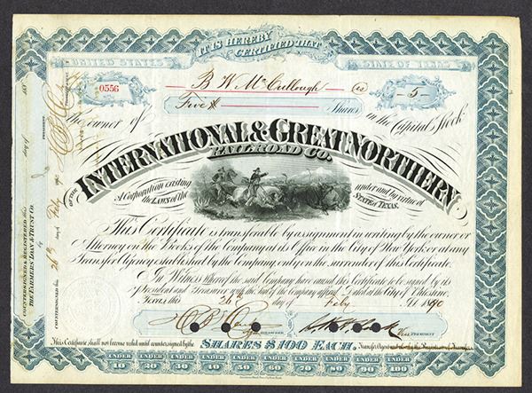 Texas. 5 Shares Issued Capitol Stock. Black ink with light blue border. Vignette of men on horse back shooting cattle. Issued and POC's along with stamped out cancels. Fine ABNC.