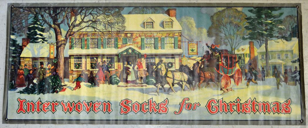 This beautiful banner of a long gone era is Christmas themed and advertises Interwoven Socks. The banner reads: "Interwoven Socks for Christmas", across the bottom and portrays holiday cheer in and around the Tavern. Child pulling a sled and a stagecoach frame the mood! This banner is made of a woven linen type material and has 4 metal grommets securely attached at the corners. Approximately 20" x 40"