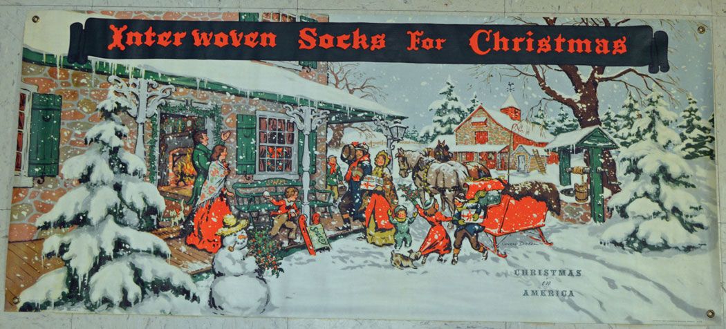 By Conrad Dickel, Another wonderfully nostalgic post War holiday advertising banner for Interwoven Socks! The Banner depicts family and friends at play celebrating Christmas of a long ago era. Farm house scene, horse drawn sleigh, child with snowball, barn with an old well! Again, vibrant colors, cheery holiday mood! Approximately 40" X 17". Virtually Mint condition.