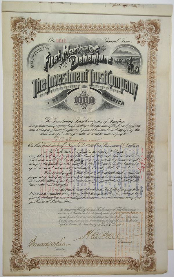 Colorado, (Offices in Topeka, Kansas). 1893. $1000 I/C 6% First Mortgage Debenture Coupon Bond, Black text with brown border, Man on horseback at top right corner. VF condition, cancelled stamps throughout and general signs of wear. John A. Lowell, Boston.