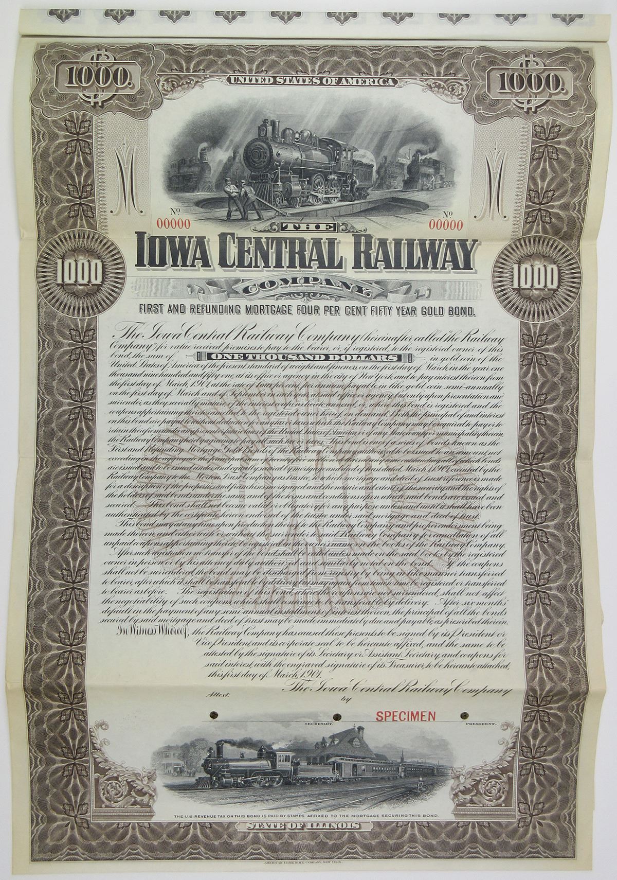 Iowa, 1901. $1000 Specimen 4% First and Refunding Mortgage Gold Coupon Bond, Black text with brown border and undertint, Train on turnstile with men at work at top center. Red specimen overprints, 00000 serial numbers, POCs. Fine-VF condition, ABNC.