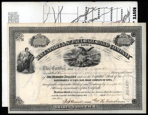 Iowa, November 2nd, 1870. 1 Share, Issued and uncancelled stock certificate, black with no underprint, Seated allegorical Liberty with eagle in middle and allegorical woman on left, also included is an information sheet on the railroad as well as a map of the route, both items are in VF to XF condition and very attractive. The stock has never been seen before but the railroad was listed in Cox. Rare and possibly unique stock from an old time stamp dealers accumulation that has not been touched in years.