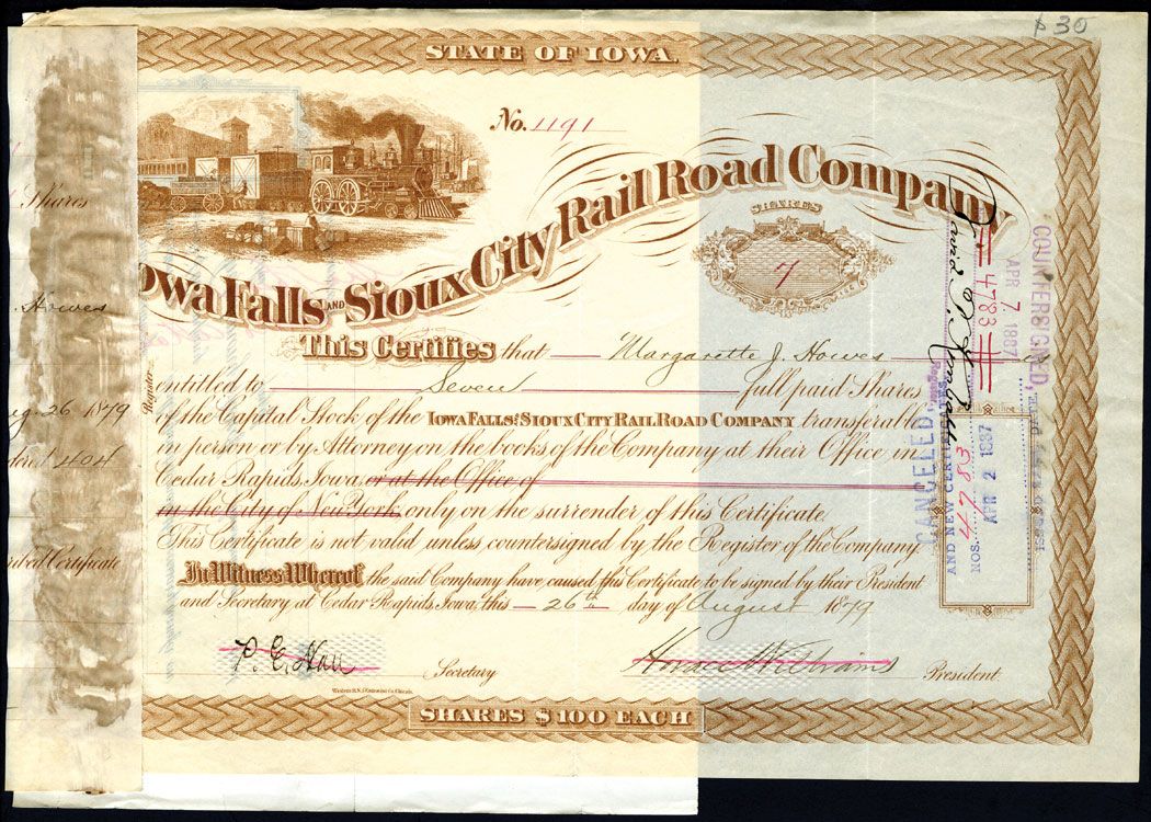 Iowa, 1879, Iowa Falls & Sioux City Railroad Co. 7 Shares, $100 each, Stock Certificate, VF Condition.