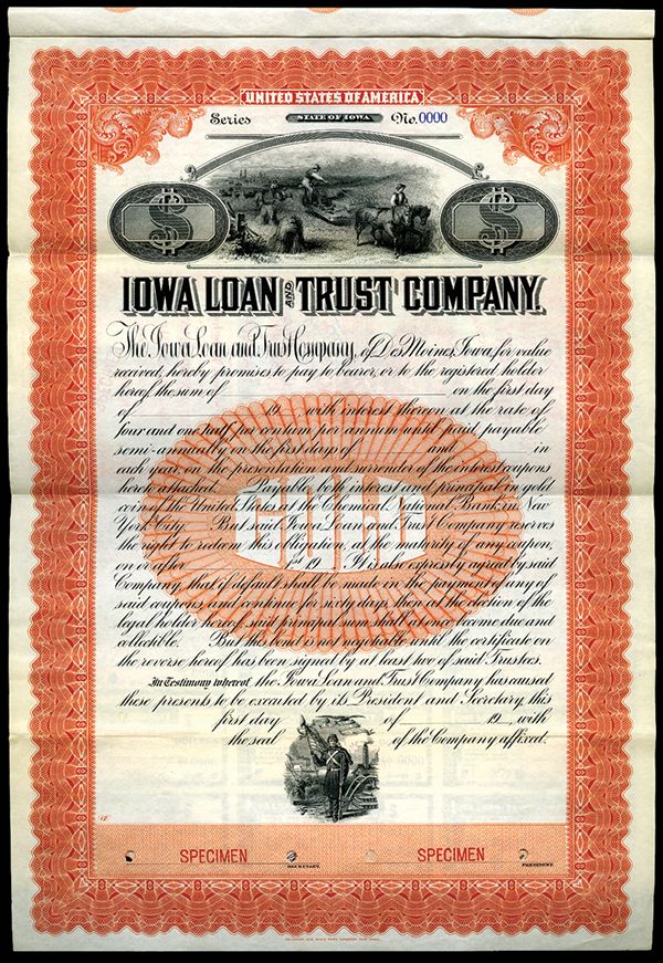 Iowa Loan and Trust Co., 1900 Specimen Bond. Iowa, 19xx (ca.1900-10), $-Odd, Specimen 4 1/2% Mortgage Bond, Orange border with harvest scene, POC's, Coupons attached. XF.
