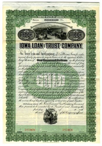 Iowa. $1000 Specimen odd% Coupon Bond, Black print on green border and under tint, Men plowing field at top, Specimen overprints and POC's, Fine-VF condition, FL-ABNC.