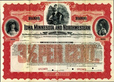 Iowa; Minnesota. ca.1900. $10,000. Specimen Registered 1st Mortgage, 3-1/2%, Gold Bond. Red border. Seated allegorical woman in middle and allegorical female portraits on left and right. Red specimen overprints, POC's and "00000" serial numbers. XF condition. Rare and attractive bond. Listed railroad in Cox, unlisted as bond. ABNC.