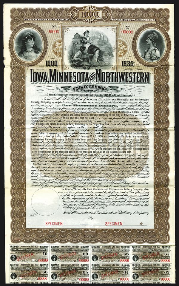 Iowa, 1900. $1000. 1st Mortgage 3 1/2% Gold Coupon Bond. Brown border and undertint. Allegorical women with bee hive, train and factories in middle with allegorical women on left and right. Coupons attached. XF condition. POC's. ABNC. Rare bond. Listed only as a stock in Cox.