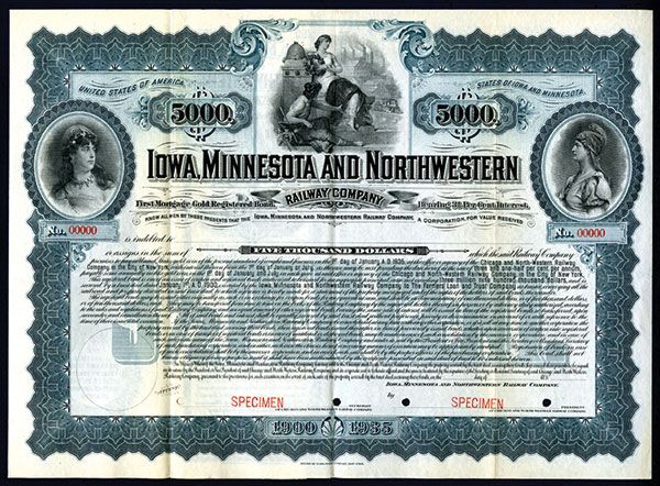 Iowa and Minnesota, 1900, $1000 Registered Specimen 3.5% Gold Bond, Blue border with allegorical vignettes, POC's, XF condition, ABNC. Listed railroad but unlisted bond in Cox.