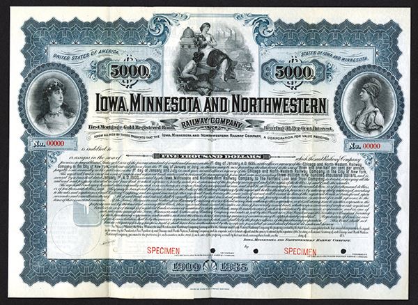 Iowa and Minnesota, 1900, $1000 Registered Specimen 3.5% Gold Bond, Blue border with allegorical vignettes, POC's, XF condition, ABNC. Listed railroad but unlisted bond in Cox.