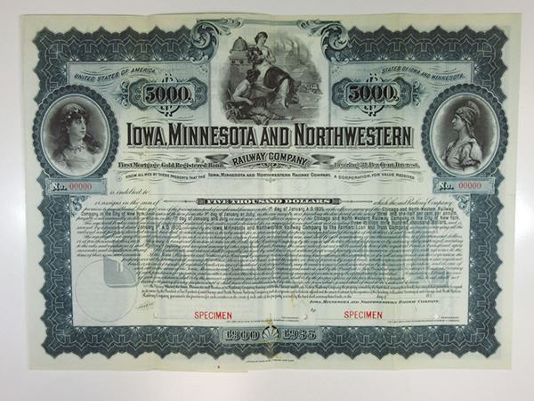 Iowa, 1900. Specimen $5000, 1st Mortgage 3 1/2% Registered Gold Bond. Slate blue border and undertint. Allegorical women with bee hive, train and factories in middle with allegorical women on left and right. VF/XF condition. POC's. ABNC. Rare bond. Listed only as a specimen in Cox.