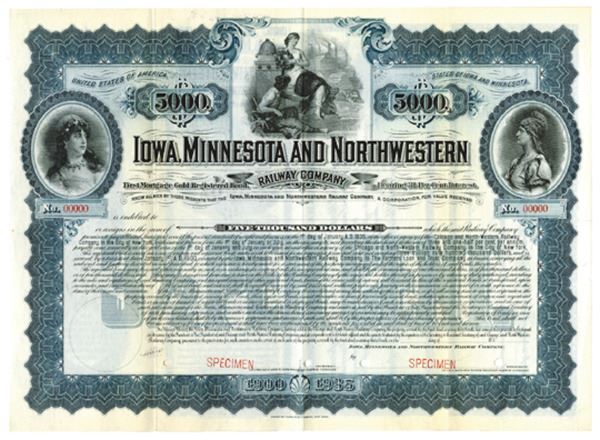 Iowa & Minnesota. $5,000 Specimen 3.50% Registered 1st Mortgage Gold Bond, Black print on large blue border and under tint in horizontal format, Allegorical woman together at top, Specimen overprints and POC's, VF-XF condition, ABNC.
