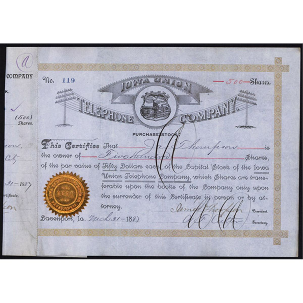 Iowa, Davenport, 1887, 500 Shs., Round seal flank by telephone wires and poles with title following the wires, Gold frame and gold foil seal on light blue paper, VF.