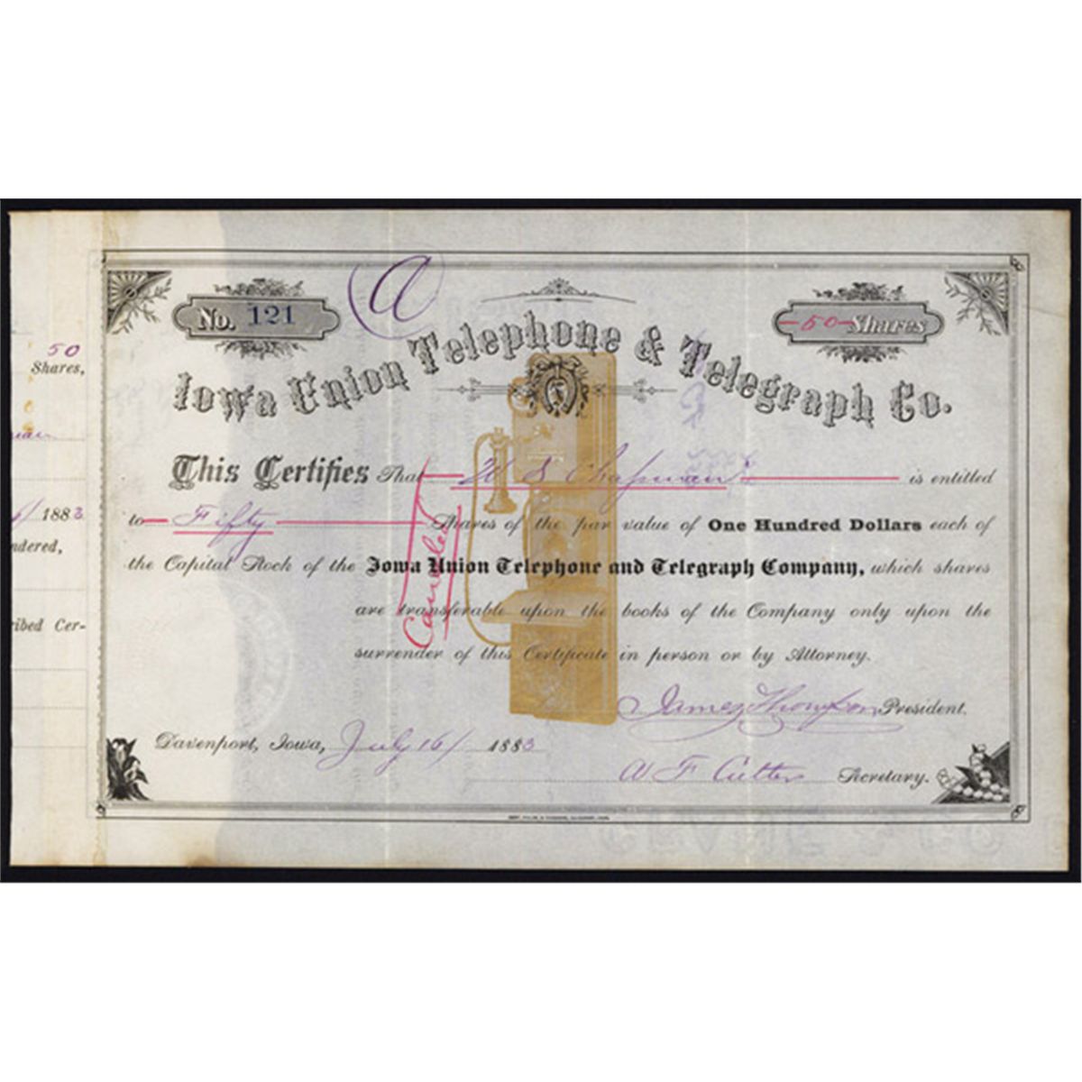 Iowa, Davenport, 1883, 50 Shs., Amazing Gold underprint of a telephone, VF with counterfoil glued to left margin, Cert.#121, Rare and very attractive telephone stock with one of the earliest detailed telephone illustrations up to that time on a stock certificate.