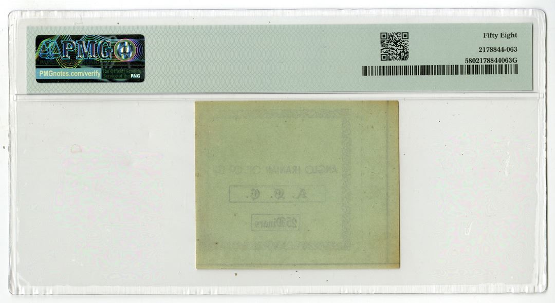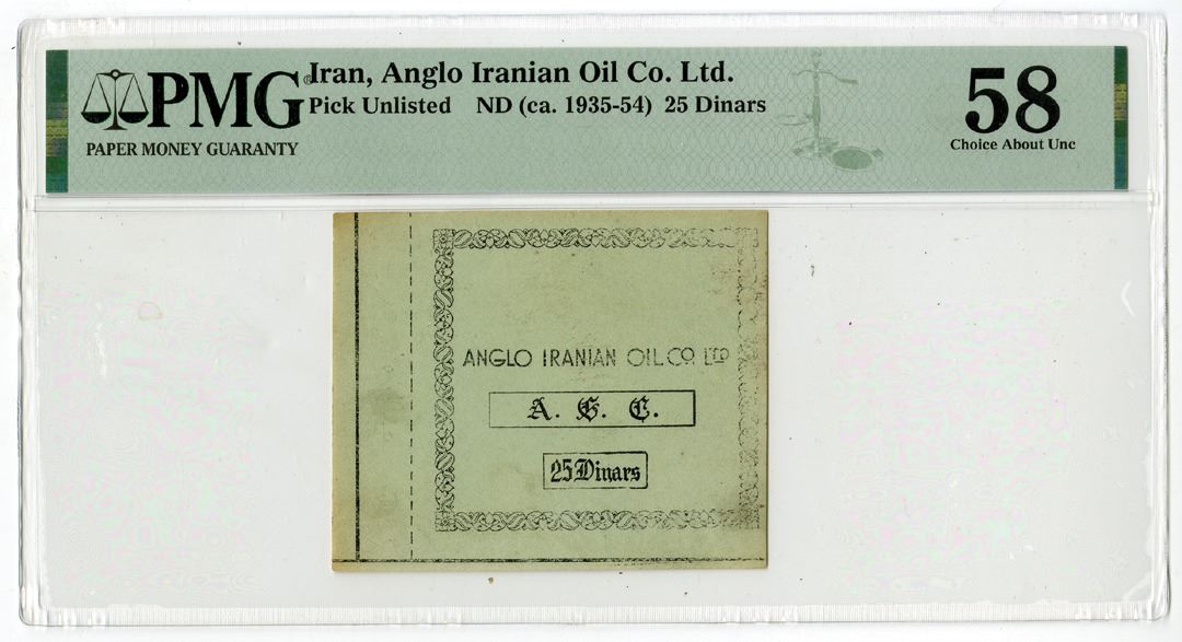 Iran and United Kingdom. Anglo Iranian Oil Co. Ltd., ND (ca.1935-54) Issued Scrip Note, 25 Dinars, P-Unlisted, Black printing on light turquoise paper, blank back, PMG graded Choice About Unc. 58. The Anglo-Iranian Oil Company (formerly the Anglo-Persian Oil Company and currently BP) had been drilling for oil in Iran since 1913. In 1908, a British venture capitalist discovered oil in southern Iran. Throughout the early 20th century, the ruling Pahlavi government made various concessions with the British that gave the UK control over certain elements in the Iranian economy. In 1951, Iran began the nationalization of their oil industry. On 26 May 1951, the UK took Iran to the ICJ, demanding that the 1933 agreement be upheld and that Iran pay damages and compensation for disrupting the UK-incorporated company's profits. Iran ignored the ruling. Despite the outcome of the case, the British government was determined to both reclaim control of Iran's oil fields and signal to other countries that nationalization efforts would lead to retaliation._ Along with the United States government, it began an oil boycott against Iran as a means of cutting off petroleum profits and weakening the Iranian government. The value of the rial fell by 45%. Following this, the UK's intelligence service, MI6 requested assistance from the United States' newly-formed Central Intelligence Agency (CIA) to overthrow Mosaddeq. What followed was a series of disruptions and eventually Mosaddeq was overthrown in a coup in August 1953 with Mohammad Reza Shah returning to Iran. Rare and historic oil industry fiscal document.