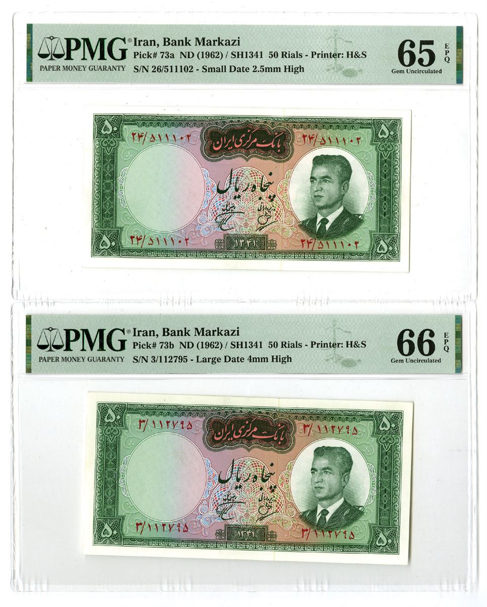Iran, ND (1962). 50 Rials, P-73a and P-73b, Issued Banknote Pair, Both are green on m/c underprint with portrait of Shah Pahlavi at right, Backs are green with dam at center, S/Ns 3/112795 and 26/511102, Notes are PMG graded: First is Gem Unc 65 EPQ and other is Gem Unc 66 EPQ. H&S. (2).