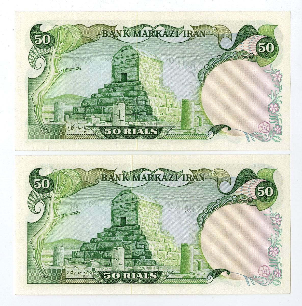 Iran, ND (1970-80s). 50 Rials, P-111a (2), Issued Pair of Banknotes, Green on brown, blue and m/c underprint, Persian carpet design type VIII at left and covering of portrait of Shah Pahlavi at right, Watermark area without overprint, Back is m/c with Tomb of Cyrus the Great at Pasargadae at left, S/Ns 285/790979 and 285/790987, Notes are in AU to UNC condition. TDLR. (2). Sold "AS IS" no returns accepted.