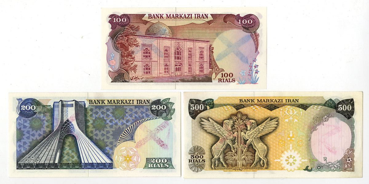 Iran.., ND (1974-79). Lot of 3 issued Banknotes, Includes: 100 Rials, P-102d; 200 Rials, P-103e; 500 Rials, P-104d. All notes have large X's at left and right side of covering the Shah's face and watermark image, Notes are in AU to UNC condition. TDLR. (3). Sold "AS IS" no returns accepted.