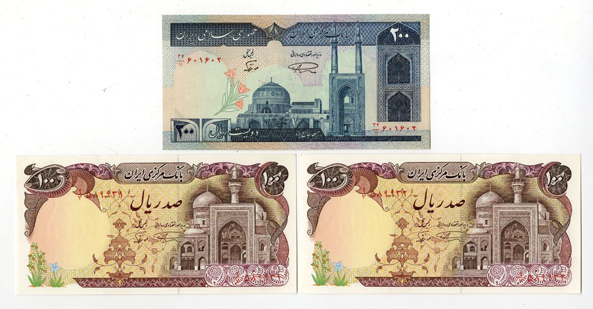 Iran, ND (1982). Lot of 3 Issued Banknotes, Includes: 100 Rials, P-135 (2), Maroon on light brown and m/c underprint with Ima Reza at right, TDLR; 200 Rials, P-136a, Aqua blue-black on m/c underprint with Mosque at center, TDLR. Notes are in UNC to Gem UNC condition. (3). Sold "AS IS" no returns accepted.