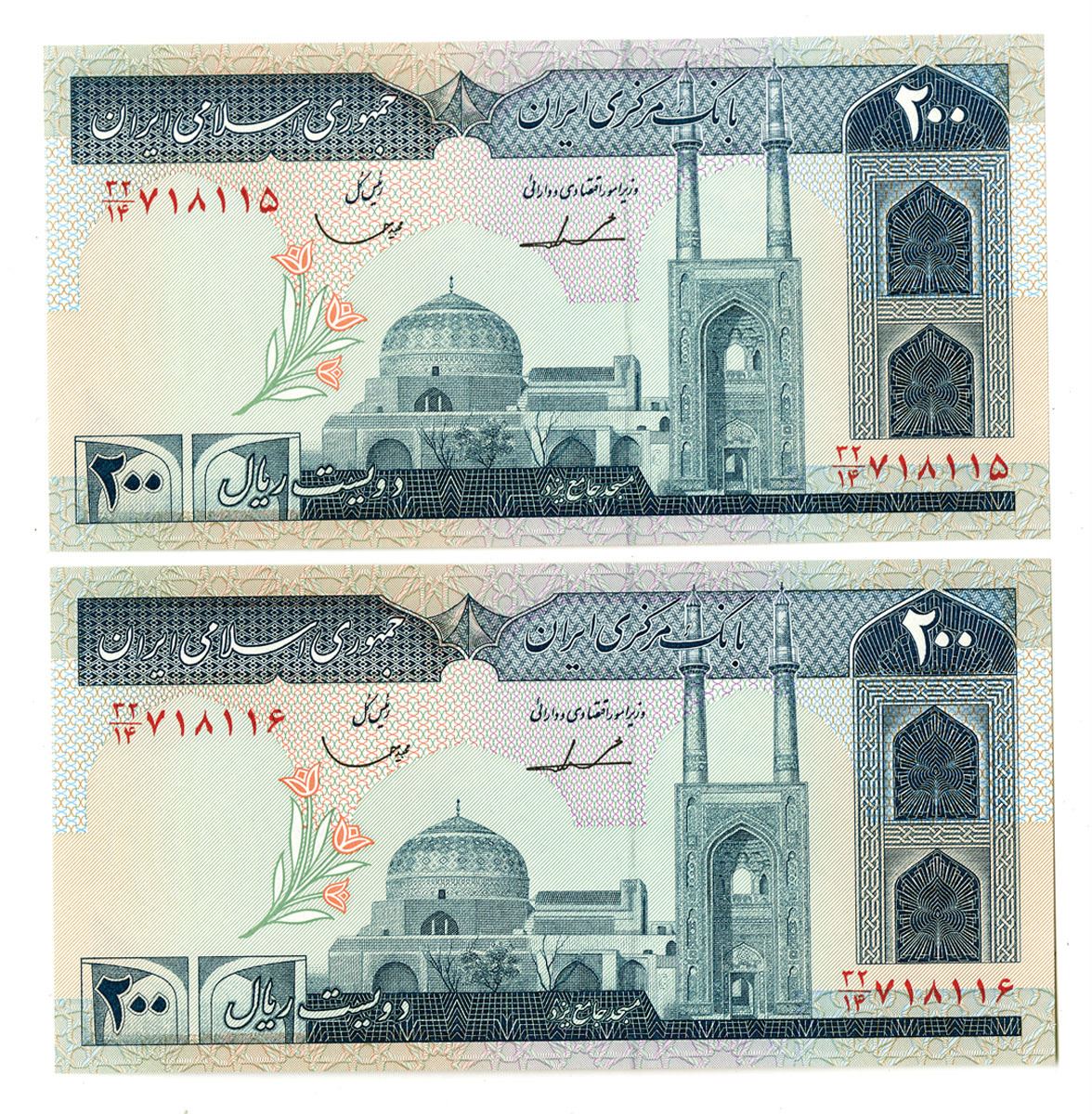 Iran..., Lot of 2, ND (1982). 200 Rials, P-136b, Issued Sequential Banknote pair, Aqua and blue-black on m/c underprint with mosque at center, Back is m/c with farmers and tractor. Notes are in UNC to Gem UNC condition. TDLR. (2). Sold "AS IS" no returns accepted.