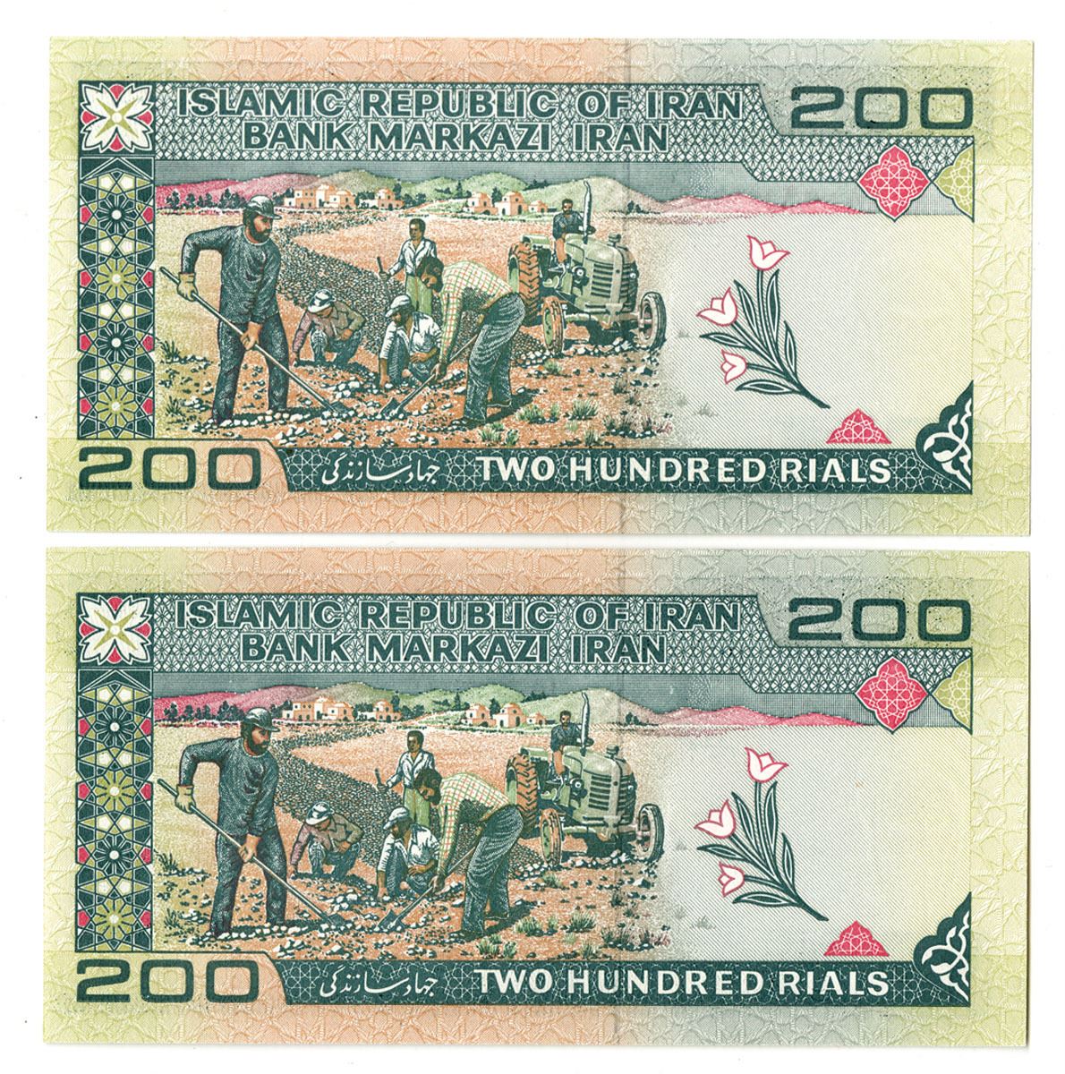 Iran, Lot of 2, ND (1982). 200 Rials, P-136e, Issued Sequential Banknote Pair, Aqua and blue-black on m/c underprint with mosque at center, Back is m/c with farmers and tractor. Notes are in UNC to Gem UNC condition. TDLR. (2). Sold "AS IS" no returns accepted.