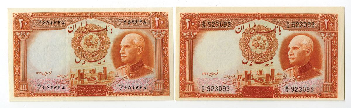 Iran....., 1937-38. 10 Rials, P-34Aa and P-34Ab, Issued Banknote Pair, Both notes are orange on m/c underprint with portrait of Shah Reza in three-quarter profile at right, S/Ns printed in Western and Persian styles, Notes are XF to AU condition. (2). Sold "AS IS" no returns accepted.
