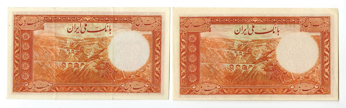 Iran....., 1937-38. 10 Rials, P-34Aa and P-34Ab, Issued Banknote Pair, Both notes are orange on m/c underprint with portrait of Shah Reza in three-quarter profile at right, S/Ns printed in Western and Persian styles, Notes are XF to AU condition. (2). Sold "AS IS" no returns accepted.