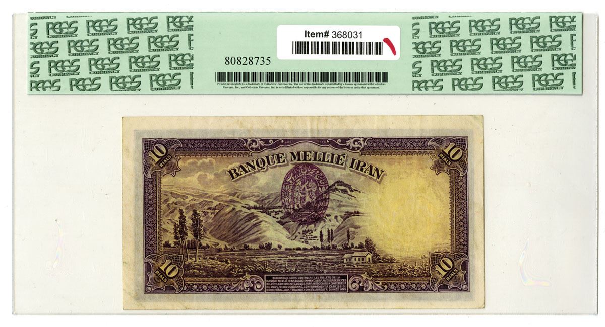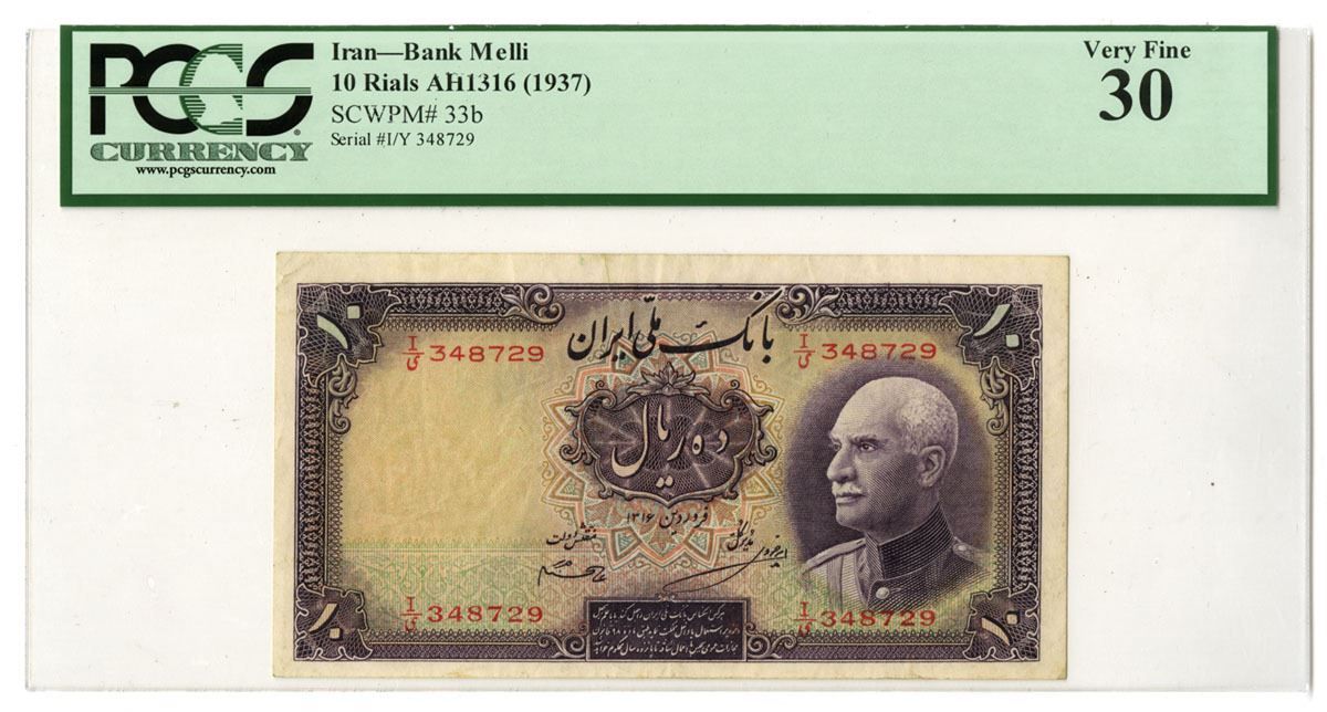 Iran, 1937. 10 Rials, P-33b, Issued Banknote, Purple on m/c underprint with portrait of Shah Reza in three-quarter face towards left without cap at right, Back is purple on m/c with mountain at center, S/N I/Y 348729, PCGS graded Very Fine 30