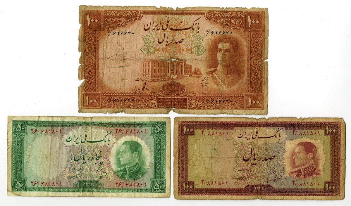 Iran, ND (1944)-1954. Lot of 3 Issued Banknotes, Includes: ND (1944), 100 Rials, P-44; 1954, 50 Rials, P-66; 1954, 100 Rials, P-67. Notes range from Fine to Fine+ condition. (3). Sold "AS IS" no returns accepted.