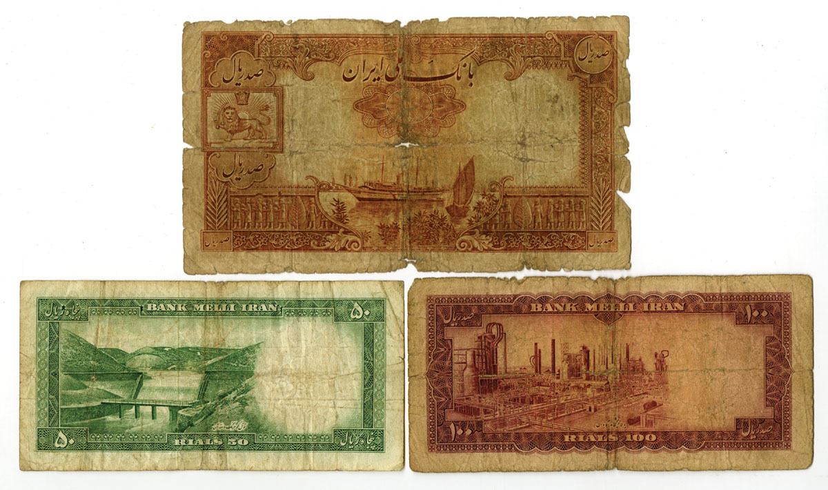 Iran, ND (1944)-1954. Lot of 3 Issued Banknotes, Includes: ND (1944), 100 Rials, P-44; 1954, 50 Rials, P-66; 1954, 100 Rials, P-67. Notes range from Fine to Fine+ condition. (3). Sold "AS IS" no returns accepted.