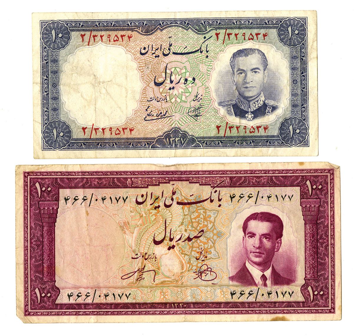 Iran, 1951-58. Lot of 2 Issued Banknotes, Includes: SH1300 (1951), 100 Rials, P-57, Maroon on m/c with third portrait of Shah Pahlavi at right; Sh1337 (1958), 10 Rials, P-68, Dark blue on m/c with fifth portrait of Shah Pahlavi at right. Notes range from Fine to Choice Fine condition. Printed by Harrison. (2). Sold "AS IS" no returns accepted.