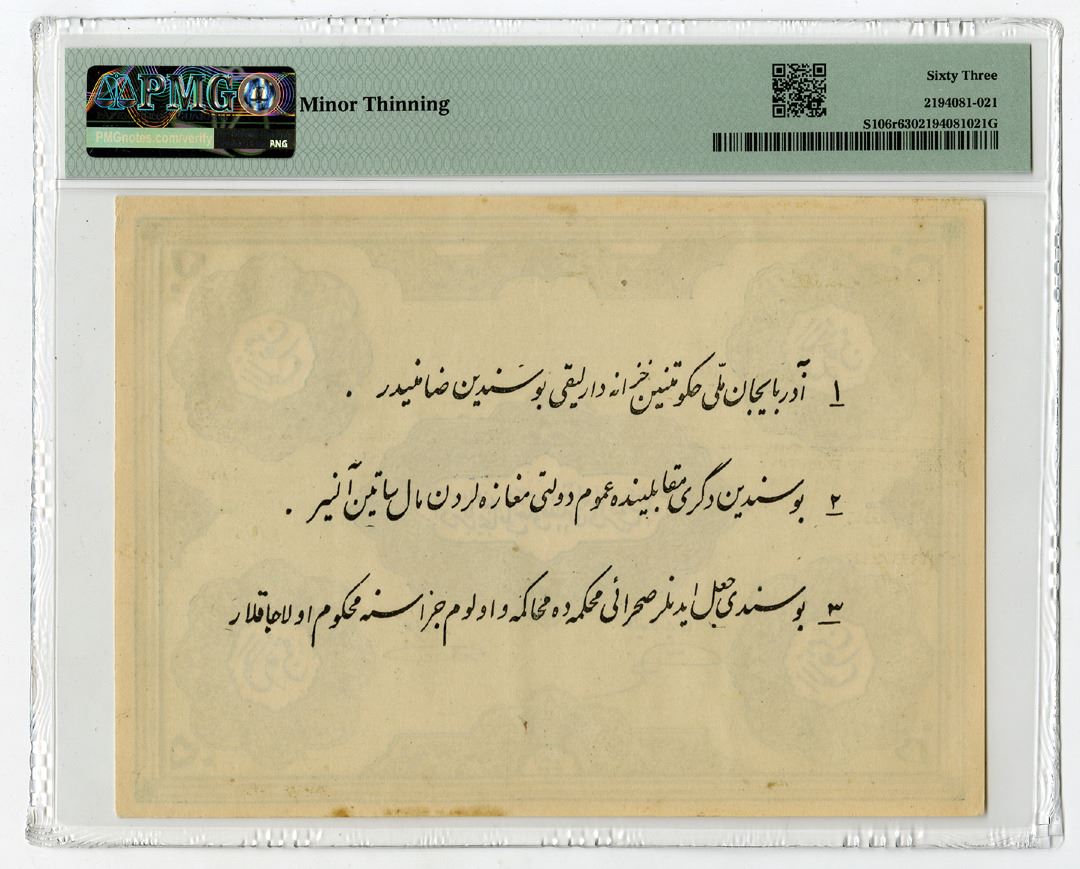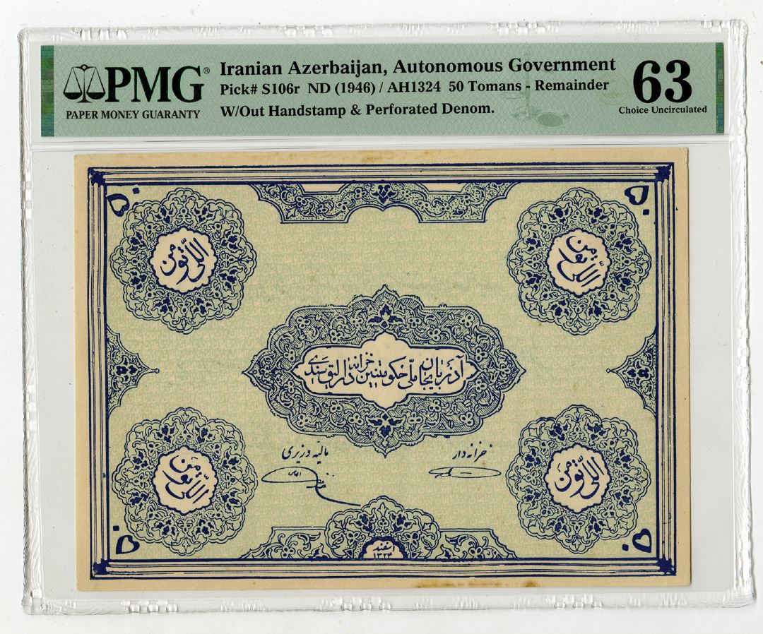 Iranian Azerbaijan, ND(1946)/AH1324, 50 Tomans, P-S106r, Issued Remainder Banknote, Blue on gray underprint with ornate guilloches, PMG graded Choice Uncirculated 63.