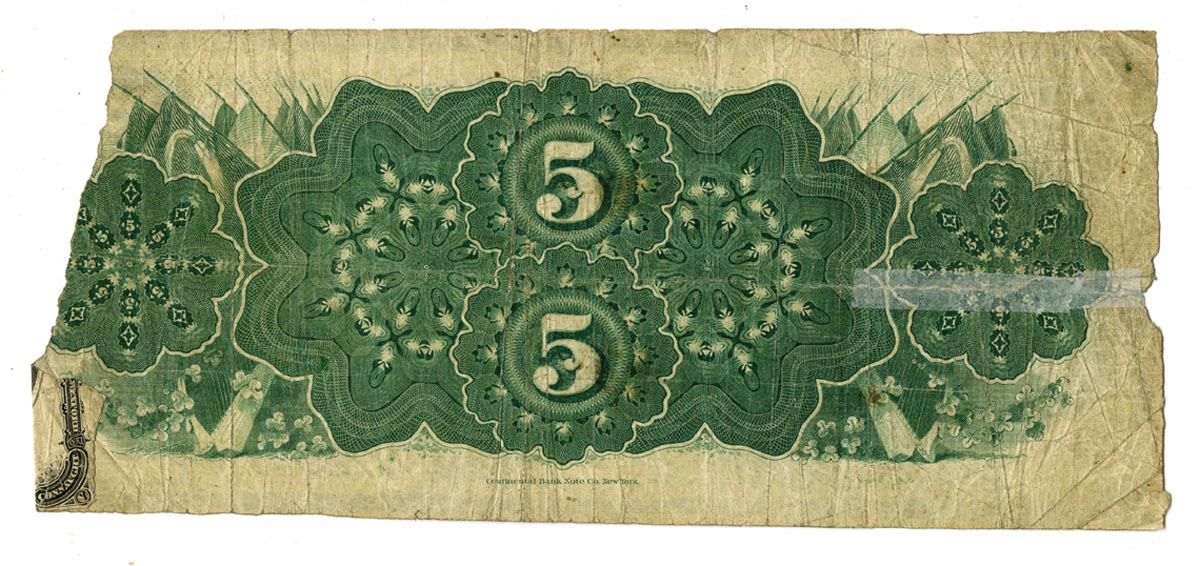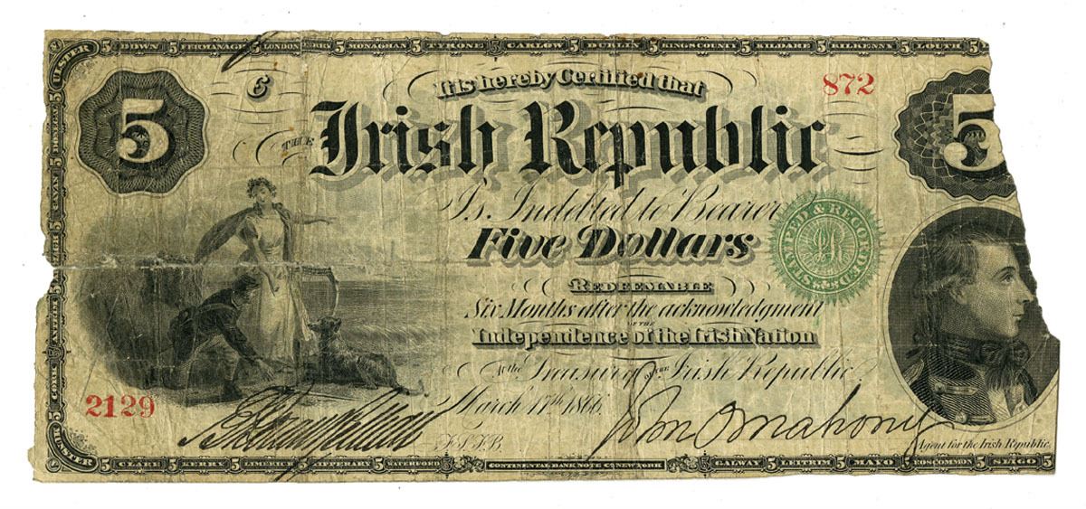 Ireland, 1866. 5 Dollars, P-S101, Issued Banknote, Black print with green seal at right, Standing allegorical woman at left and portrait of man at right, Uniface banknote, S/N 872 2129, Fine condition with right border cut into. CONB.