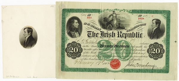 Irish Republic, $20, Plate C, I/U, 6% bond payable 6 months after the Independence of the Irish Nation, Black on green border and under print, Standing allegorical woman at top, large green 20 in middle and portraits of Irish notables at left and right with the right portrait with matching Large Die Proof vignette, red seal at bottom, back blank. S/N 373 - 1628, Large borders, XF with mounting remnants on back right border. Continental BNC. First time this denomination has been offered by us. (Ex.1992 Memphis, From the collection of John E. Herzog).