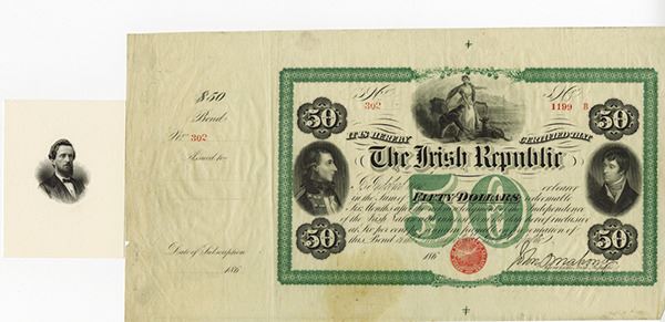 Irish Republic, $50, Plate B, I/U, 6% bond payable 6 months after the Independence of the Irish Nation, Black on green border and under print, Standing allegorical woman at top, large green 50 in middle and portraits of Irish notables at left and right, Also includes a large die proof portrait of Irish notable not used on bond, red seal at bottom, back blank. S/N 302 - 1199, Large borders, Choice VF to XF with mounting remnants on back top border. Continental BNC. First time this denomination has been offered by us. (Ex.1992 Memphis, From the collection of John E. Herzog).