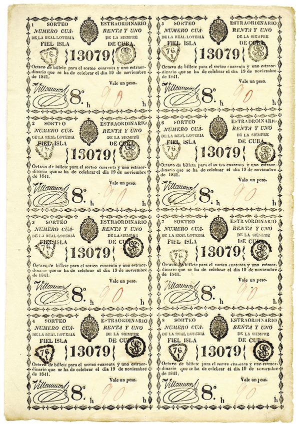 Cuba, 1841. Translates to 'Extraordinary draw number 41 of the real lottery ofÉCuba," appears to be Uncut and Unissued lottery tickets, all in Spanish, Black text with black border. The number 90 has been written on all coupons. VF condition, especially considering the piece's age.