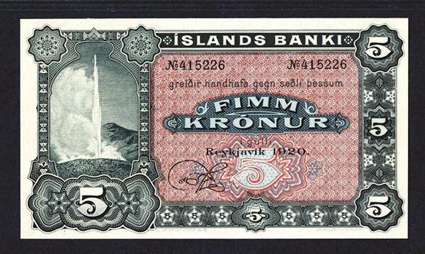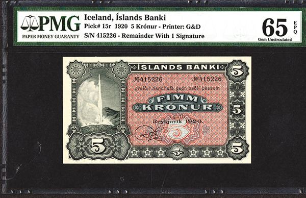 Iceland. 5 Kronur. P-15r. Geyser at left. One signature, remainder. G&D. Graded Gem Uncirculated 65 EPQ.
