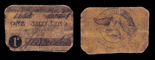 British Commonwealth, Isle of Man, September 1st, 1815, 1 Shilling, P-Unlisted, Issued early Scrip note or banknote, The name of the company or bank is Brawse Kirk Andrews, Black on light brown paper, Face with Serial number, title, denomination, title of bank, back with Isle of Man Arms, Triskelion with the motto QUOCUNQUE JECERIS STABIT ("Wherever you throw it, it stands"). Rare early Isle of Man note.