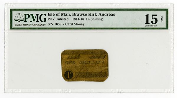 British Commonwealth, Isle of Man, September 1st, 1815, 1 Shilling, P-Unlisted, Issued early Scrip note or banknote, The name of the company or bank is Brawse Kirk Andrews, Black on light brown paper, Face with Serial number, title, denomination, title of bank, back with Isle of Man Arms, Triskelion with the motto QUOCUNQUE JECERIS STABIT ("Wherever you throw it, it stands").ÊRare early Isle of Man note.